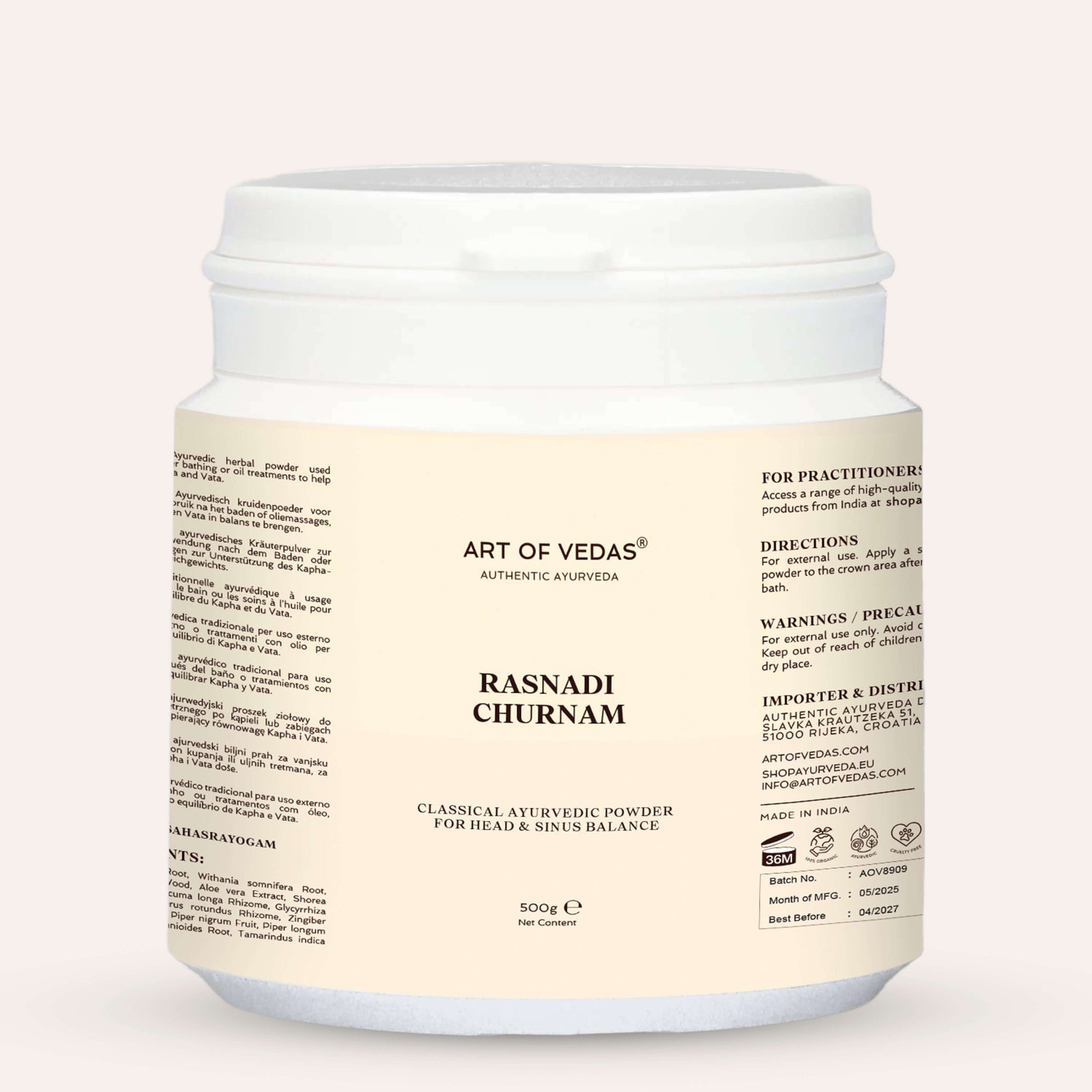 Pour usage externe uniquement. Évitez le contact avec les yeux et les narines. Conservez dans un endroit sec. Utilisez sous la supervision d'un praticien Ayurvedic.