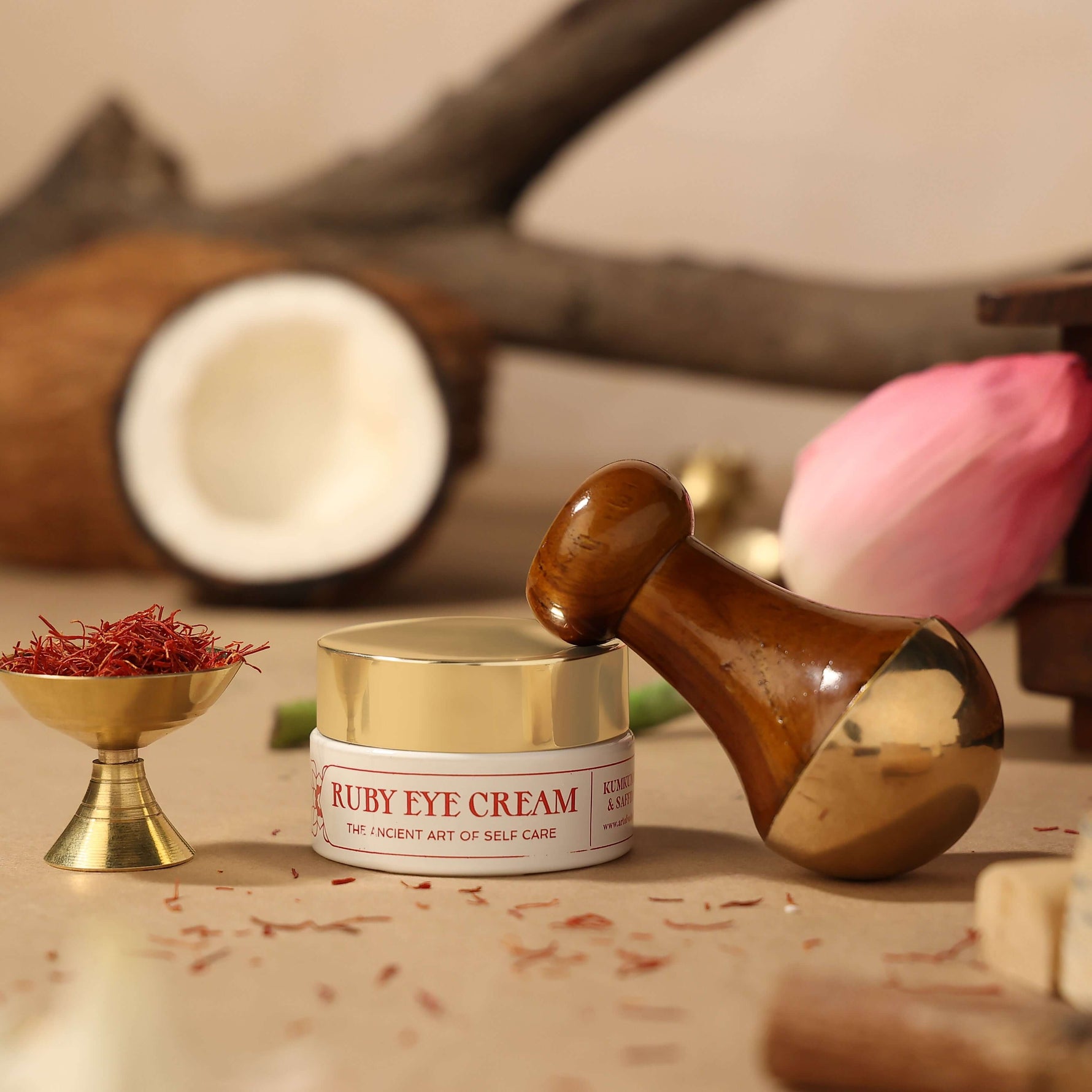 Un mélange luxueux de safran et d'herbes ayurvédiques, conçu pour hydrater, illuminer et réduire les poches, les cernes et les ridules.